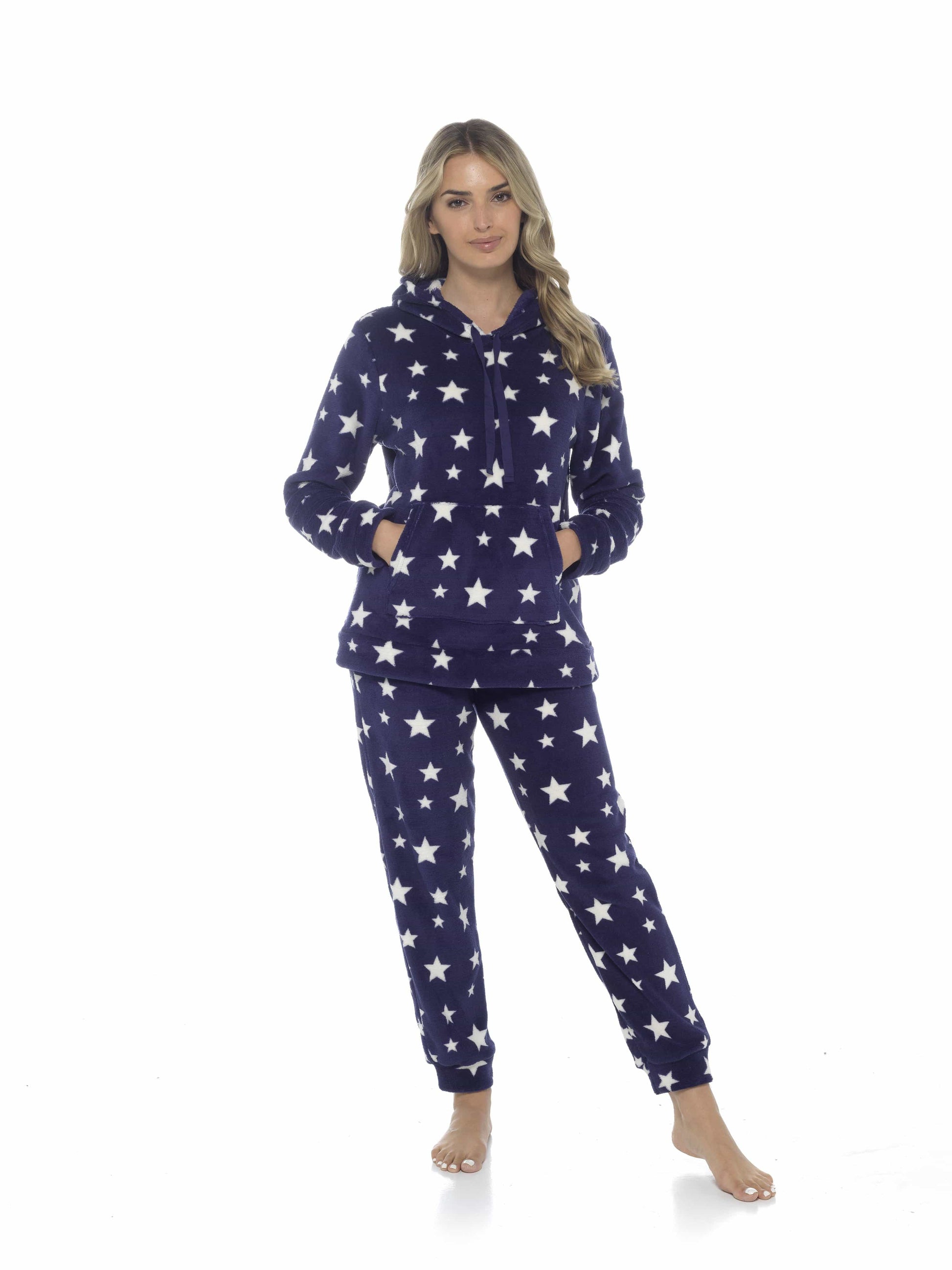 Women's Stars Plush Fleece Hooded Pyjama Set, Ladies Nightwear